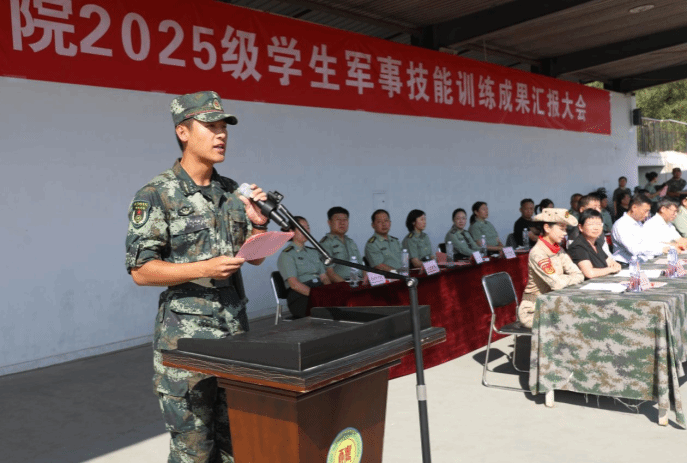 承训教官代表、水利工程学院2024级研究生董建伟回顾军训点滴,感慨学员从青涩到干练、从散漫到守纪的转变,提及“豆腐块”被子是参训学员追求卓越的缩影。他引用习近平总书记嘱托,希望参训学子延续纪律意识与吃苦精神,做到内外兼修。