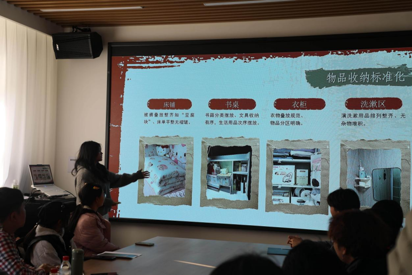 活动在宿管科李沛然老师的主持下正式拉开帷幕。李老师首先全面总结了文明宿舍创建活动的阶段性成效,向获评的标杆宿舍表示热烈祝贺,并详细解读了本次成果展示的流程与核心环节。随后,各学院标杆宿舍代表依次登台,通过精彩视频展播、干货满满的经验分享等多元形式,全方位呈现宿舍在环境布置、文化建设、学风营造、安全管理等方面的特色亮点:工程技术学院宿舍作为管理模范型代表,以“学习状态定值日”的创意机制,展现了学习与生活相融合的管理理念;水产学院宿舍作为温馨和谐型代表,秉持“为别人着想”的相处之道,传递包容互助的宿舍氛围;动物科学与动物医学学院宿舍作为学习科研型代表,浓厚的互助学习风气,彰显了勤学善思的优良学风;预科班宿舍作为文化艺术型代表,同学分享的多元民族文化融合故事,让宿舍成为文化交流的温馨港湾;经济管理学院宿舍作为卫生健康型代表,同学们“相互提醒、携手共进”的默契配合,让宿舍环境变得干净、整洁;人文学院宿舍作为书香浸润型代表,展现文科学子的良好风貌,在宿舍中弘扬中华民族优秀传统文化。