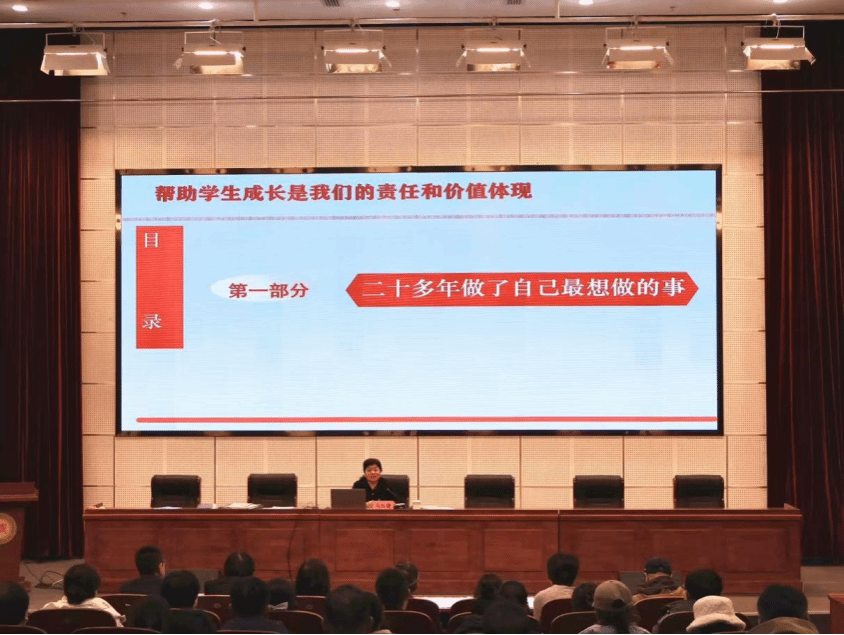 马红健老师结合自身二十余年学生工作实践,重点阐释了新时代辅导员、班主任在学生成长中的关键作用与价值定位,深入解读了辅导员在“三全育人”体系中的核心职责,围绕学生成长不同阶段的需求,系统阐述了新生适应性教育、学风建设、班级活动策划、学业帮扶、思想引领等关键工作的实践路径与方法技巧。同时,她分享了五个核心学生工作理念,提出要关注全体学生、以真诚关爱引导学生,助力辅导员实现从“事务型”向“专家型”转变。整场宣讲内涵丰富、贴合实际,既有理论引领,又有实操指导,对我校进一步提升辅导员队伍专业素养、强化育人工作实效具有重要的指导意义。