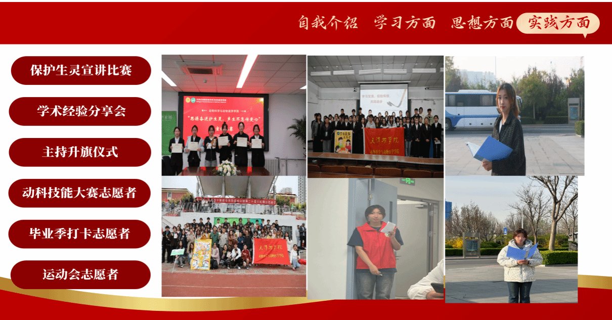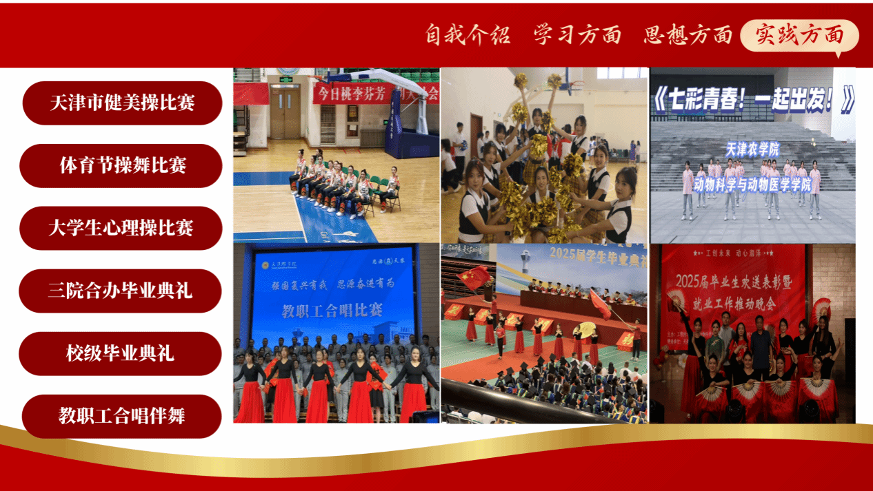 实践中,她全面发展、多才多艺,积极投身各类校园文化和社会实践活动。在天津市健美操比赛中屡获佳绩,斩获校级体育节操舞大赛、大学生心理操比赛第二名,作为舞蹈演员参与三院合办毕业典礼、校级毕业典礼等,用活力与风采诠释青春之美。
