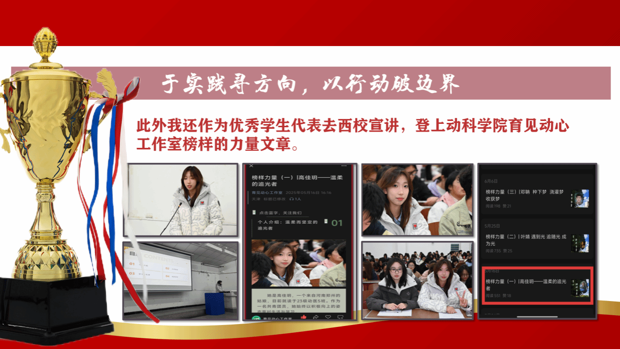 工作中,她认真负责、履职尽责,作为班级班长,始终心系同学,积极搭建师生沟通桥梁,组织各类班级活动,凝聚班级向心力,营造勤学善思、团结向上的班级氛围;作为学院办公室小助理,她踏实肯干、细心严谨,高效完成各项工作任务,得到老师和同学的一致认可。同时,她多次以主持人身份参与学院升旗仪式,以沉稳大方的表现展现学生干部的良好风貌。她积极参与学科宣讲与志愿活动,在学院保护生灵宣讲比赛中荣获第一名。