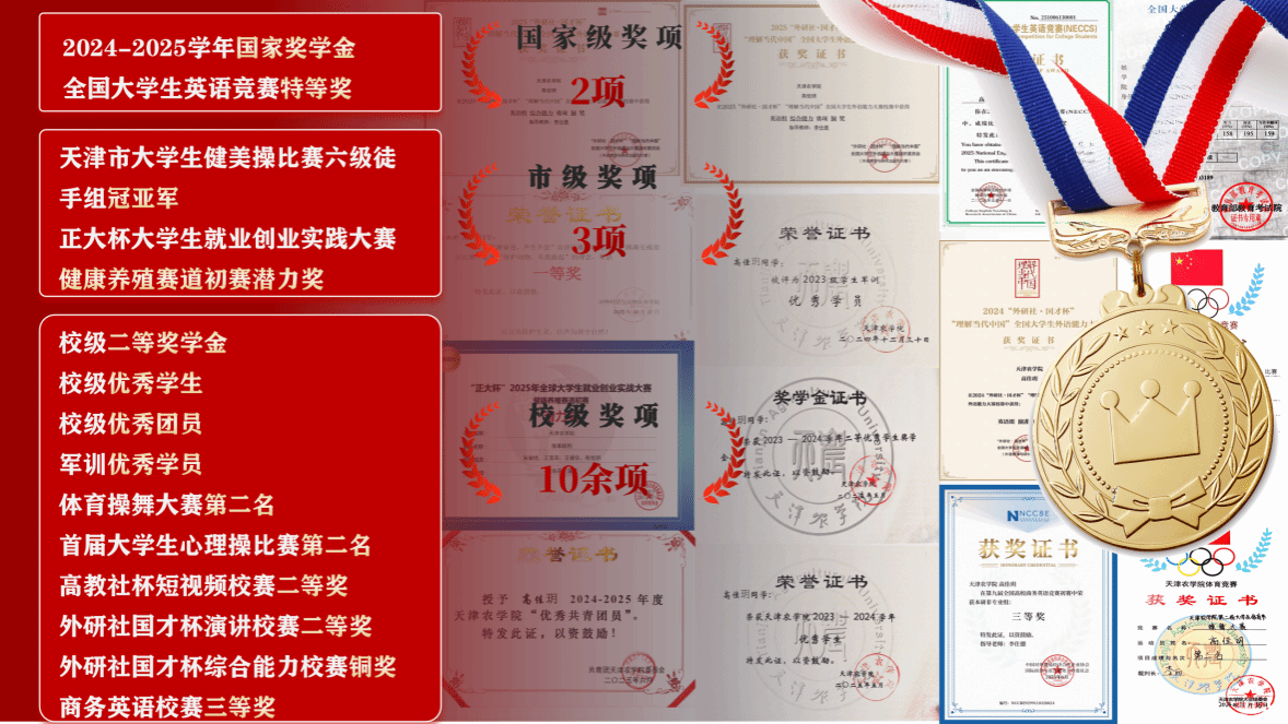 学习上,她勤奋刻苦、笃学善思,始终保持优异的学业成绩,在学科竞赛中屡创佳绩。在校期间斩获国家级奖项2项、市级奖项3项、校级奖项10余项,其中包括国家奖学金、全国大学生英语竞赛特等奖、天津市健美操六级徒手组冠亚军、“正大杯”健康养殖赛道初赛潜力奖等,以扎实的专业能力和综合素养展现了天农学子的过硬本领。
